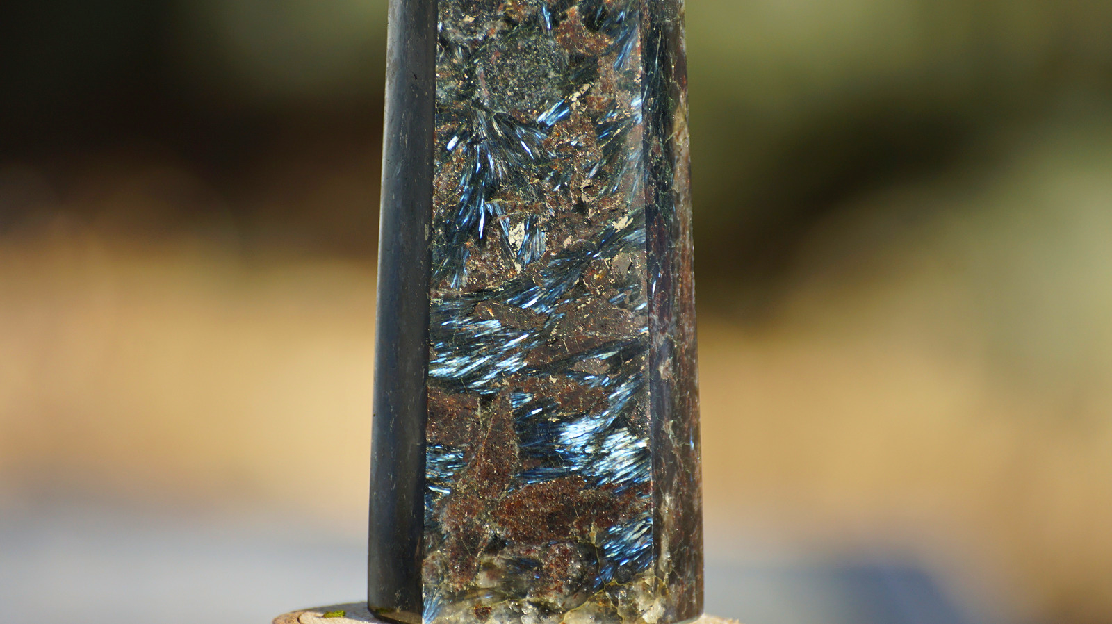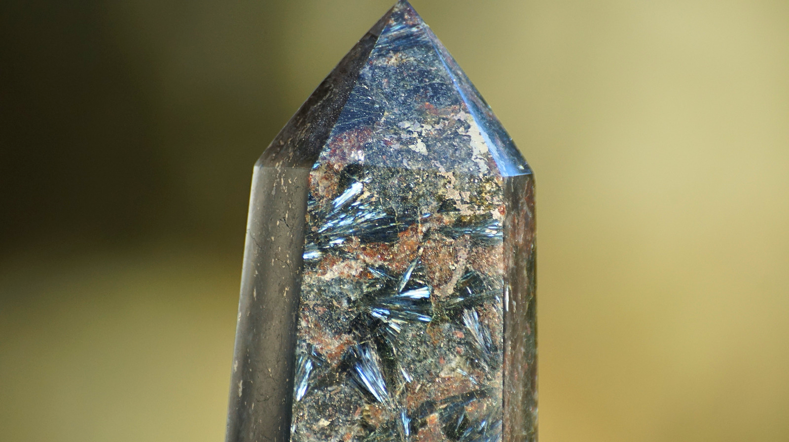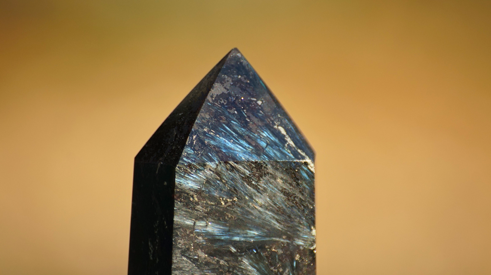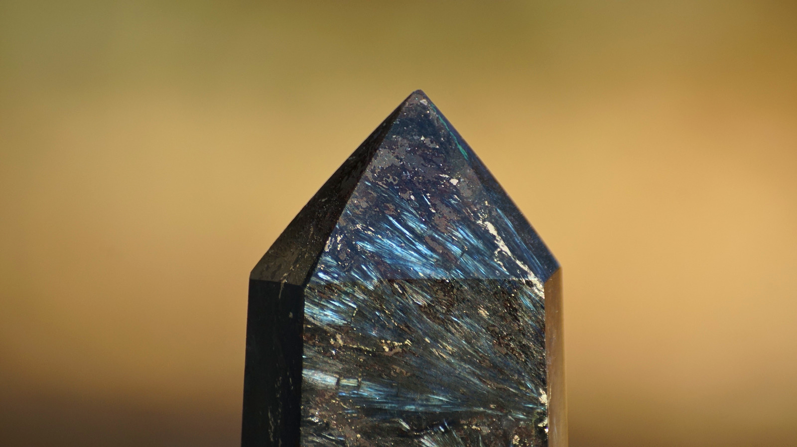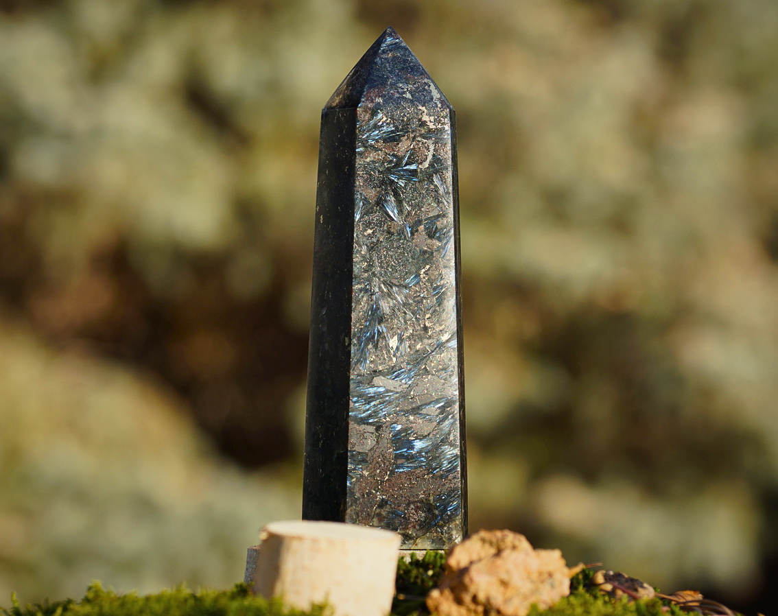 Reach new heights with the Arfvedsonite Tower! This metaphysical wonder is crafted from natural black and shimmering blue stone with chunks of garnet inlaid throughout.
