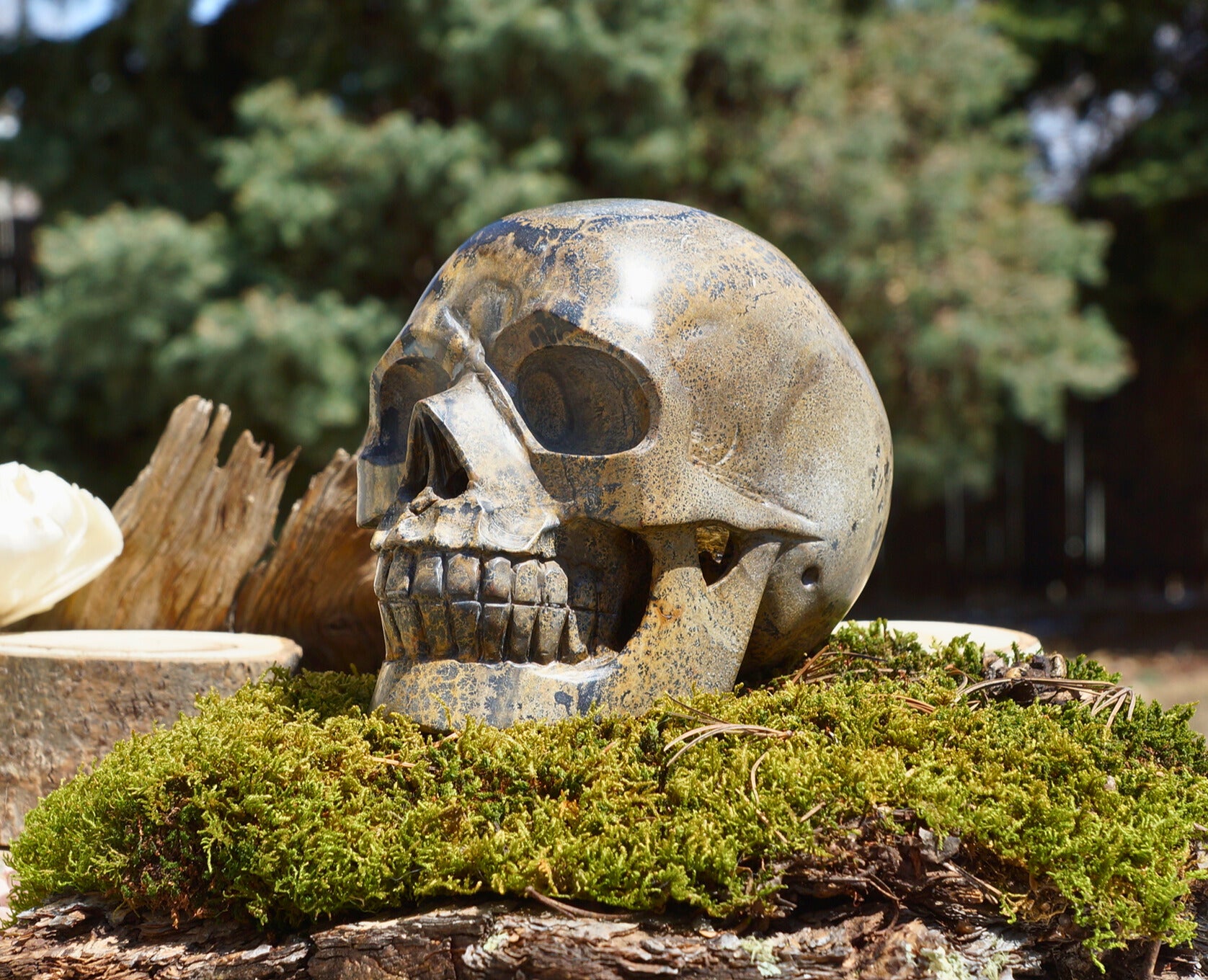 Though carved from stone, this skull still manages to convey the spirit of the original - a testament to the artistry that went into its creation.